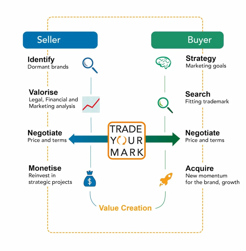 TradeYourMark® offers an innovative approach by giving a second life to registered trademarks. We help trademark owners sell dormant trademarks or trademarks they no longer want to use. At the same time, we help companies who wish to buy immediately available trademarks.